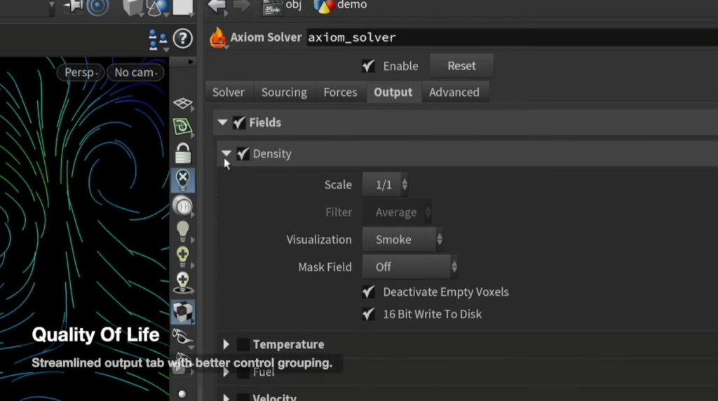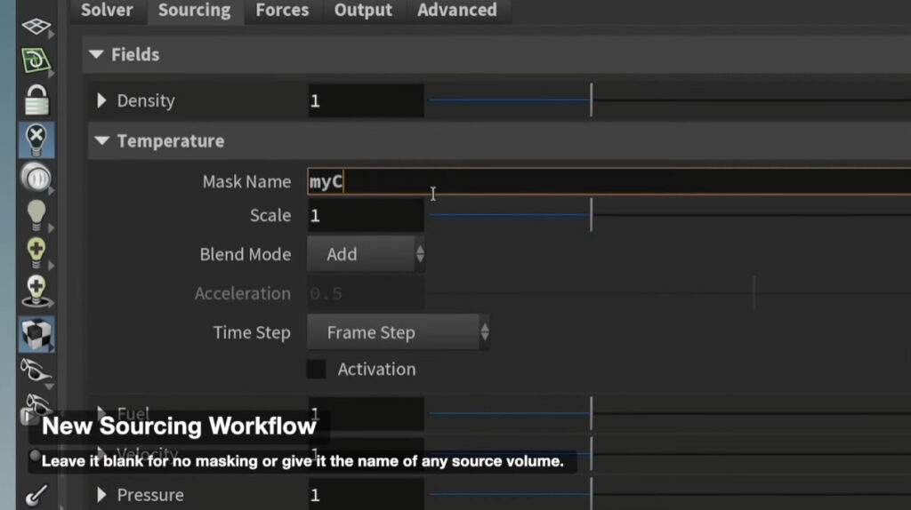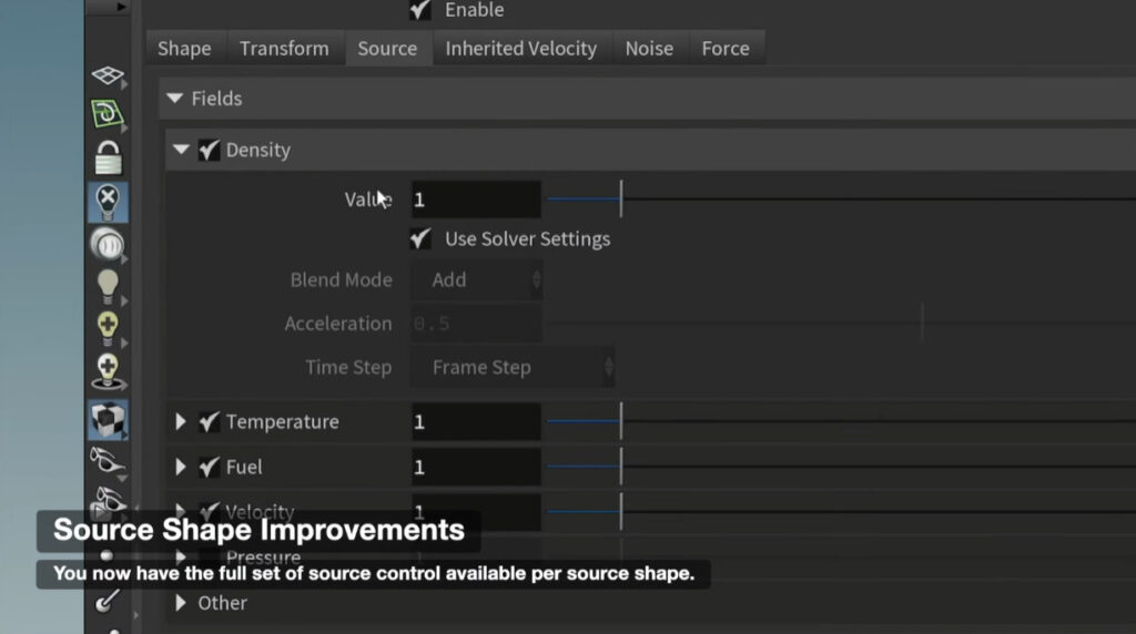 - Influence Source は削除。代わりに Custom Source を導入。任意の入力 VDB に名前を付け、個別のソース設定とブレンドモードを使って任意のフィールドへソース可能。マルチパラメータで、事実上無制限にカスタムソースを追加できます。